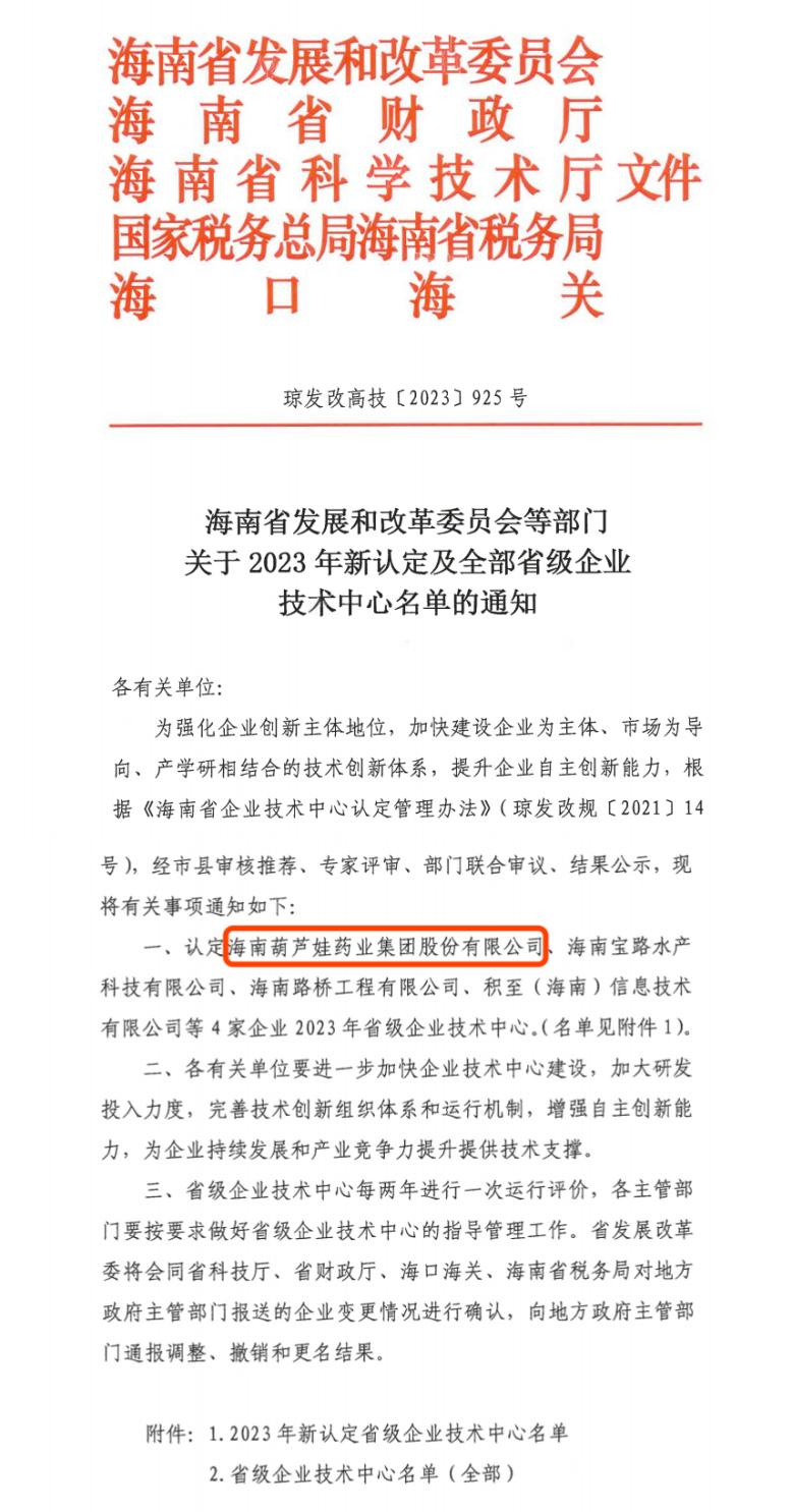 近日,海南省发改委等多部门联合公布了《关于2023年新认定及全部省级企业技术中心名单的通知》,其中,海南DB视讯药业集团股份有限公司成功通过评审,被认定为省级企业技术中心,是本次获批的4家企业之一。